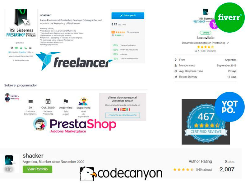 Algunos reconocimientos dentro del área de PrestaShop: Obtuve altas calificaciones mientras me desarrollé como freelancer en Freelancer.com, Addons Prestashop y Fiverr.